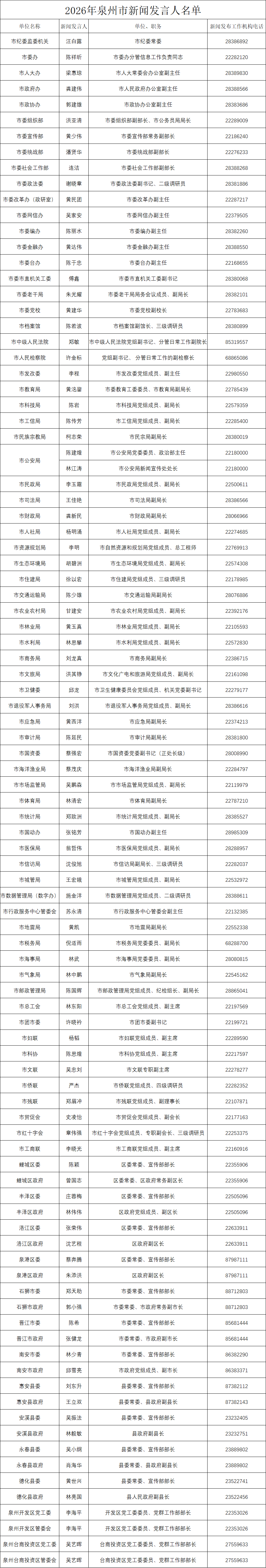 泉州市政府新闻办公室发布了2026年泉州市新闻发言人名单