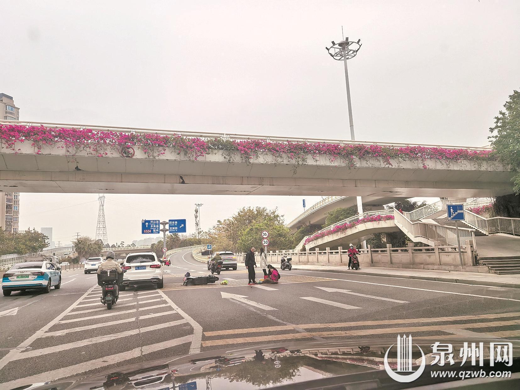 3月27日8时20分许,记者途经中心市区江滨北路时便目睹了一起事故。在江滨北路右转田安路的匝道处,一名女子骑行电动车与一辆欲右转上匝道的小车发生碰撞,女子倒地受伤,现场随即出现短暂拥堵。4月1日8时,记者再次在江滨北路目击一部电动车被小车刮倒。记者走访发现,作为城市快速通道,江滨北路的机动车道上每日都有大量电动车穿行,尤其在匝道口等节点,剐蹭事故时有发生。