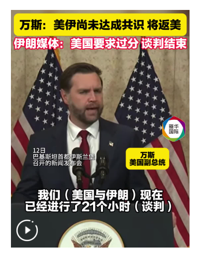据巴基斯坦媒体报道,万斯12日已乘专机离开巴基斯坦。