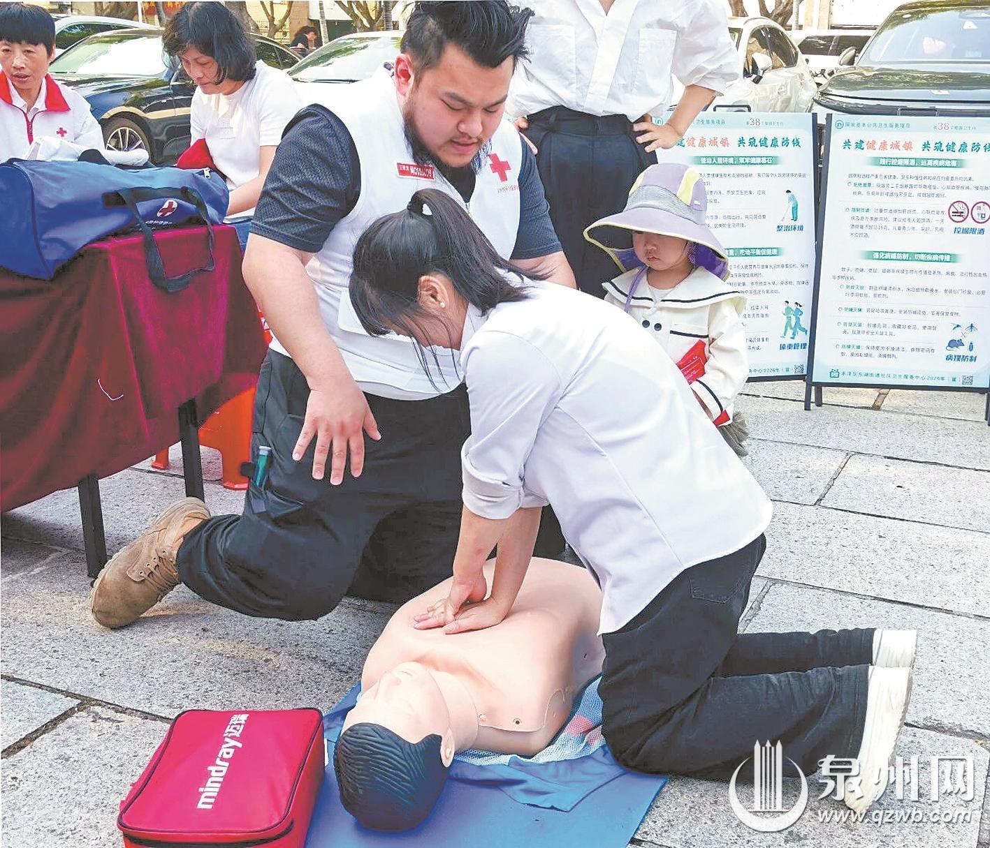 在中医康复理疗区,中医师为居民开展体质辨识并定制个性化保健方案,针对颈肩腰腿痛提供的推拿、拔罐、刮痧等特色理疗,让居民在家门口体验到传统中医的独特疗效。丰泽区红十字会志愿者则在急救演示区手把手教学心肺复苏,讲解急救关键要点,居民们踊跃体验,现场互动氛围热烈。