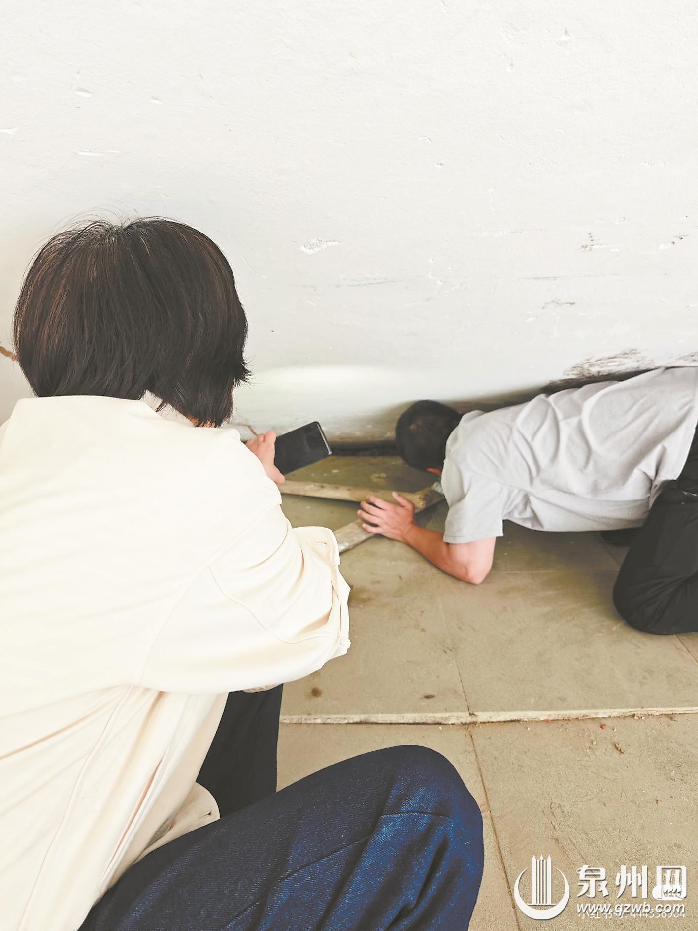 接到求助电话的是泉州非遗馆一名女性工作人员。在仔细询问位置与现场情况后,她叫上一名男同事一同赶往现场。抵达后,两人发现水泥缝隙空间狭小,里面都是尘土,带钉木梁死死卡住小猫,几乎没有操作空间,他们决定徒手施救。
