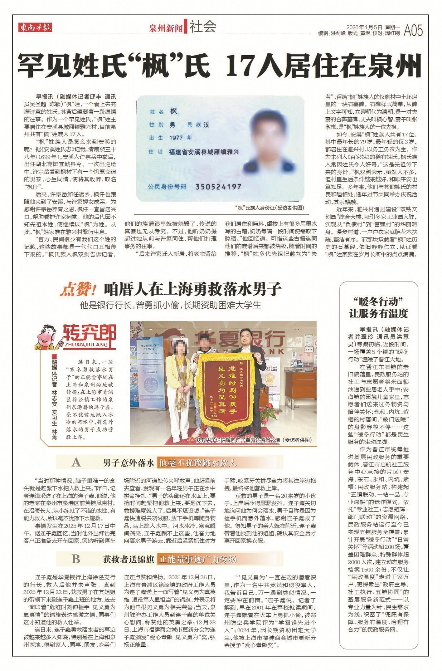 连子鑫的老家在泉州市泉港区,目前在上海市青浦区工作。2025年12月17日中午,他外出拜访完客户正准备去开车回家时,听到停车场附近的河道处传来呼救声,他赶紧前去查看,发现有一名年轻男子正在水中拼命挣扎。连子鑫快速脱去羽绒服、放下手机等随身物品,马上跳入水中奋力地向落水男子游去,咬紧牙关拼尽全力将其往岸边拖拽,最终将他营救上岸。