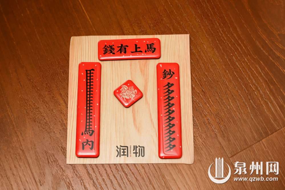 在古城中山路游客服务中心的润物文创旗舰店,融入金鱼巷网红象声字对联元素的冰箱贴受到游客青睐,成为游客热门的伴手礼。这款冰箱贴采用古厝门头造型,既保留了对联的文字精髓,又通过现代工艺提升质感。同时,还有一款马年“马上有钱”的对联文创品,也受到了年轻人的喜爱,它采用趣味字体设计,可以贴在冰箱、书桌上,用一抹灵动装点生活。