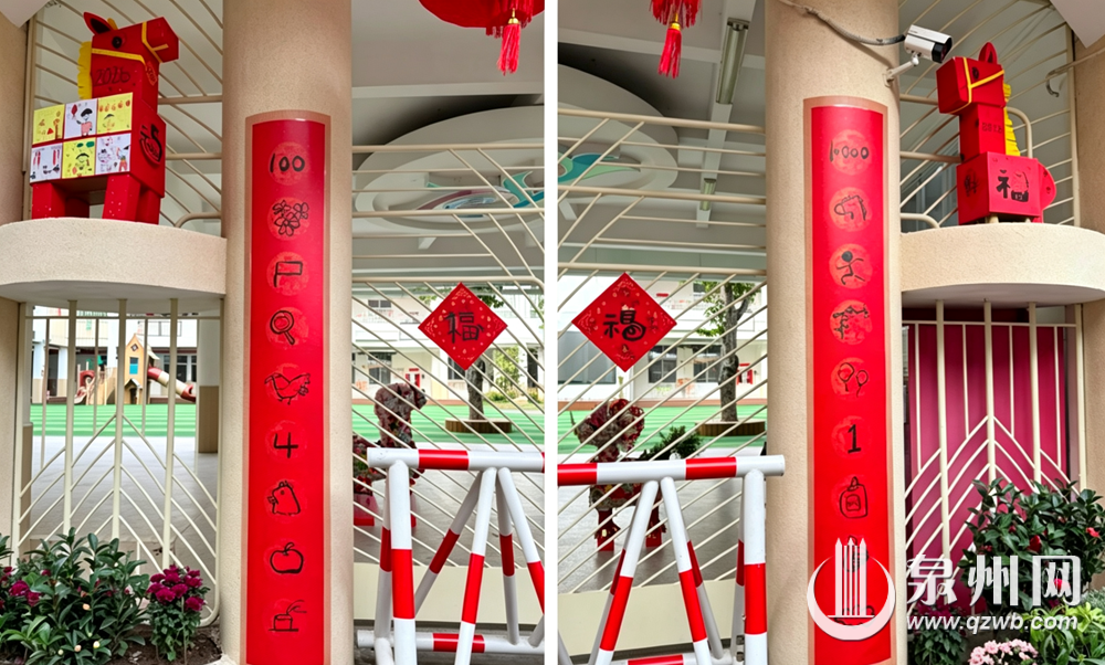 古老的智慧延续传承,泉州孩子们也将充满童趣的创意融入对联中。不久前,泉州市实验幼儿园的小朋友们创作的一副春联受到央广网、央视网、光明网等33家媒体的关注,并在社交平台上刷屏。这副对联由手绘图案和阿拉伯数字构成,据该幼儿园的蔡老师介绍:“上联的意思是‘万马奔腾期一年好运’,下联的意思则是‘百花齐放迎四季平安’。孩子们的理解跟我们成年人不一样,他们用‘气球’的‘气’的谐音‘期’来表达的‘期待’的意思,于是在对联上画了气球,表示期待一年好运。‘百花齐放’是则分别以阿拉伯数字100,花朵、旗帜、放大镜的图案来表示。孩子们用符号、图案代替文字,既直观又富有想象力。”