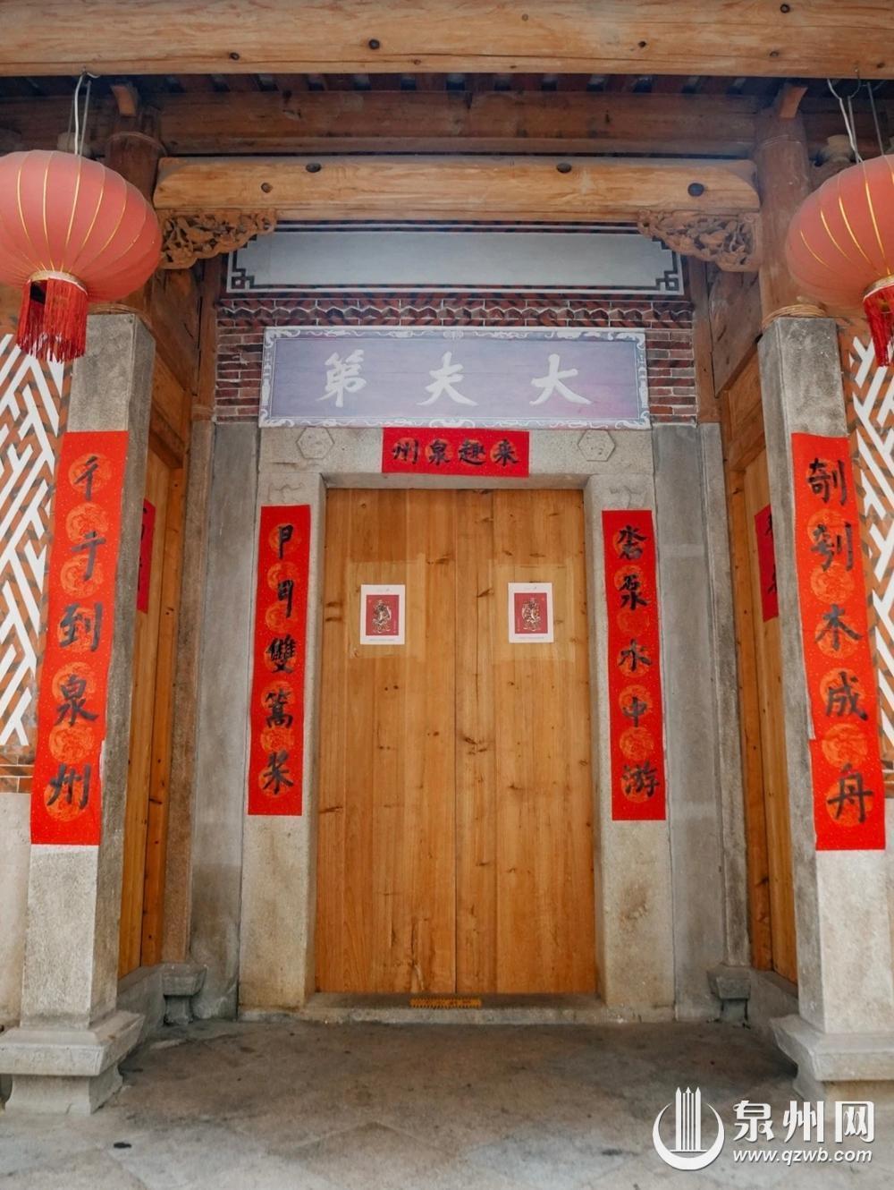 通政巷大夫第的大门上贴有红底黑字的对联,分别写着“来趣泉州”“剞刳木成舟”“沯泵水中游”等字句。每一句的前两个字为象声词,“剞(kit)刳(kok)”是斧头砍木头的声音,“沯(ping)泵(pong)”是船在水中游走的声音,通过对声音的模拟表现古代泉州造船、行船的热闹场景,这副对联有“财源广进”之意。这副对联不只是文字游戏,更是对古代泉州造船业、水运业繁荣昌盛的生动还原,对联中的象声字以听觉意象,让游客在品读间,感受“东方第一大港”的辉煌历史。