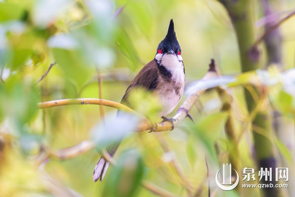 眼下,红耳鹎(bēi)已进入繁殖期,泉州市区公园和街道边的绿地、树丛,时常可以看到它们活跃的身影。红耳鹎体长17厘米至21厘米,体重一般不超过50克。头顶有耸立的黑色羽冠,眼下后方有鲜红色斑,是其明显特征。每年的4—8月,是红耳鹎的繁殖期。图为在泉州晋江大桥附近,一只红耳鹎停在记者数米之外的树枝上,被拍个正着。