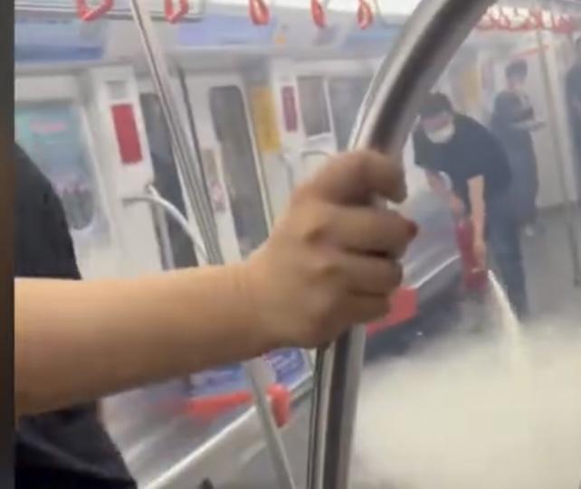 车厢内一名热心乘客反应迅速,第一时间从座椅下方找到车载干粉灭火器,对准冒烟手机果断喷射,迅速控制住险情。