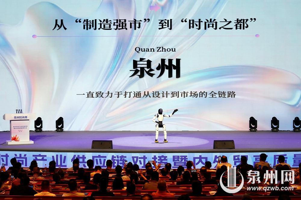 在昨日举行的泉州市时尚产业供应链对接暨内外贸高质量发展大会上,机器人主持海丝“衣创杯”服装设计大赛发布仪式。(陈晓东 摄)