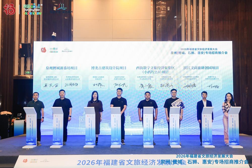 泉州网4月18日讯(融媒体记者陈智勇 通讯员李渊博) 17 日,由泉州市文化广电和旅游局、泉州市发展和改革委员会联合泉州市文旅集团、鲤城区、石狮市、惠安县人民政府共同主办的泉州(鲤城、石狮、惠安)文旅专场招商推介会在漳州市成功举行。活动紧扣 2026 年福建省文旅经济发展大会契机,现场签约 13 个重点项目,为 “宋元中国・海丝泉州” 城市品牌建设再添新动力。