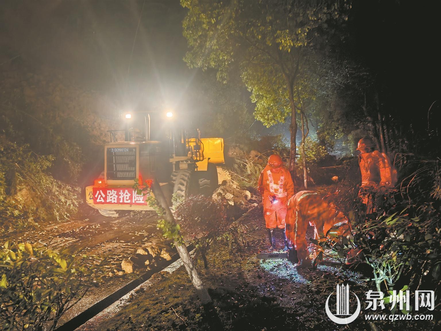 风雨中,抢险人员昼夜奋战、不畏艰险。他们第一时间在现场布设警示标识、实施交通管控,技术人员精准制定抢通方案,养护人员手持油锯清理倒伏树木,装载机、铲车则轮番作业清运土石。镇村干部全力维护现场秩序、疏导群众,筑牢抢险安全防线。经过5个小时连续奋战,清晨7时成功抢通单车道,恢复道路基本通行。