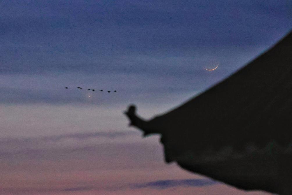 2024年11月5日傍晚在天津市静海区拍摄的金星伴月。(杨婧 摄)