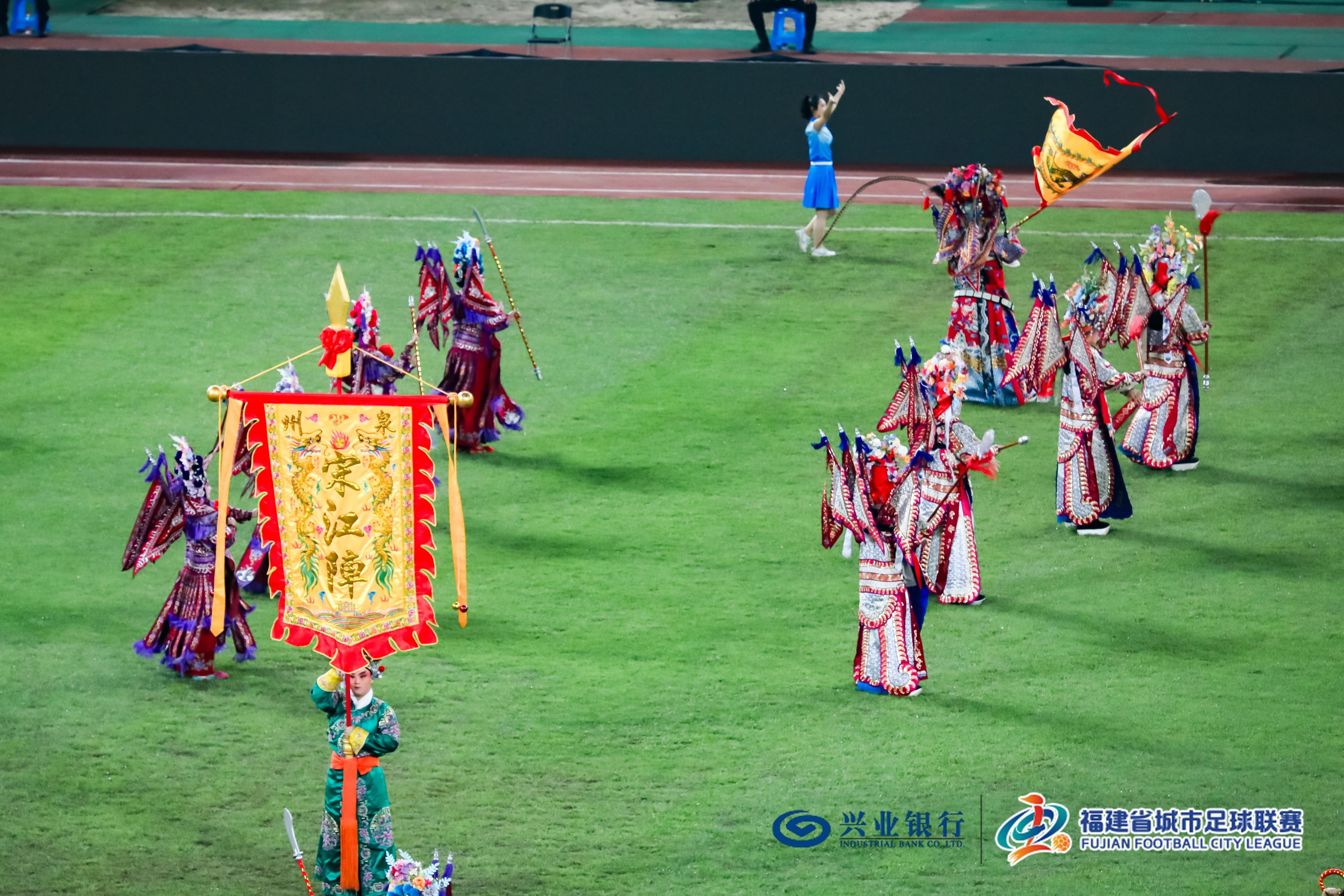 当赛场灯光聚焦中央,音乐声起,头戴簪花扮成宋江、卢俊义等水浒簪花侠士模样的旗手手持龙虎纛旗和“泉州宋江阵”大旗率先入场,泉州青狮灵动跳跃,身着精美装扮服饰演员紧随其后,沿规定路线行进或居中站位表演武打杂耍技艺、亮相造型,既彰显泉州文化特色,又贴合福建省城市足球联赛热烈、激昂的场景调性,引得现场观众阵阵喝彩。