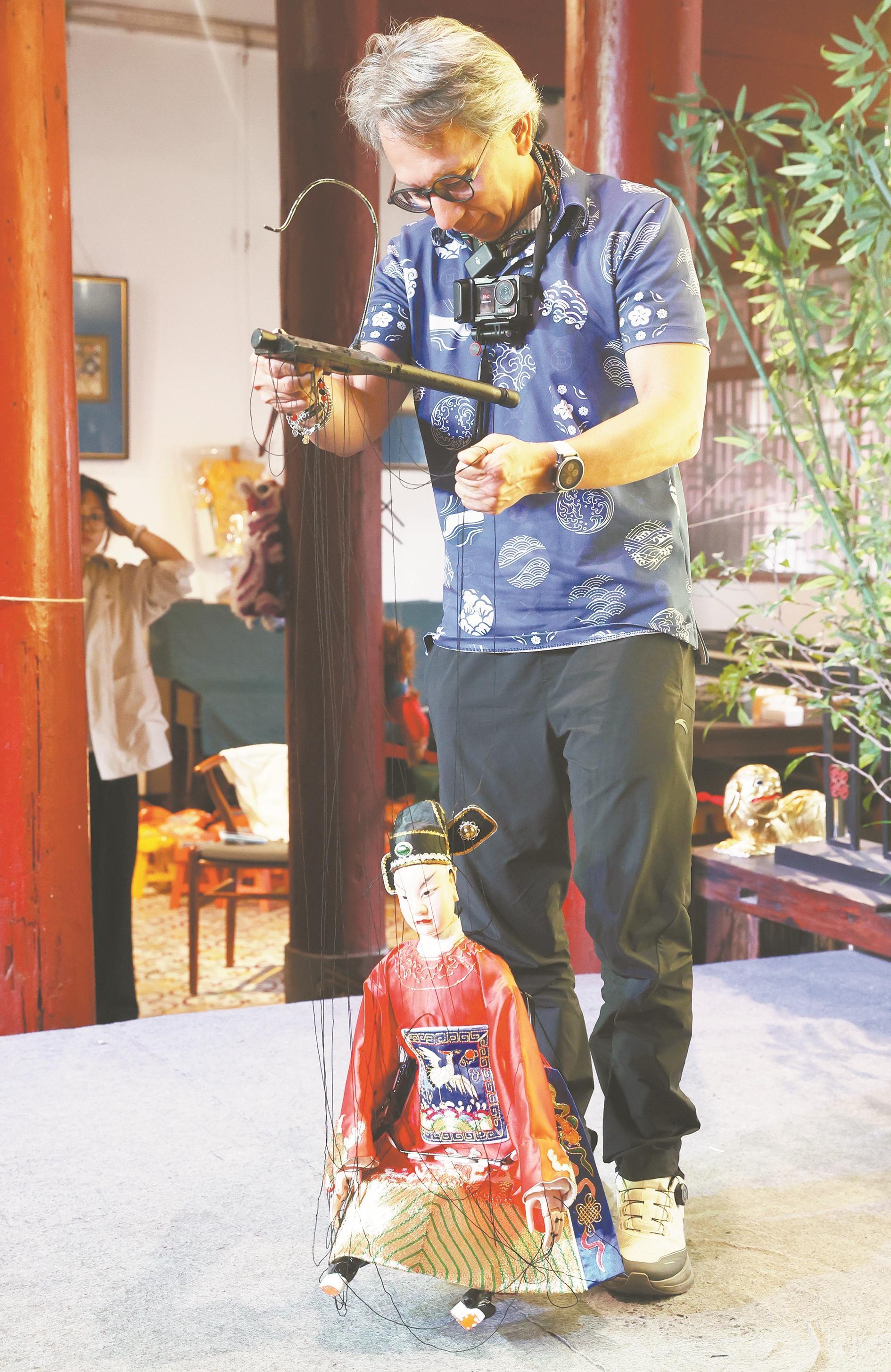 南音互动结束后,泉州木偶大师许润明为嘉宾们演出提线木偶经典《驯猴》,看到许老师操纵下的木偶猴子戴面具、弹吉他、表演自行车杂技,现场嘉宾纷纷发出阵阵惊呼,“我在想,这会不会是一只真的猴子?”来自越南的Huong Ly拍下了演出全程,惊讶地说。在互动环节,她很快便和友人积极举手上台,在二人的合作操控下,木偶很快开始“手舞足蹈”,引得台下掌声、笑声阵阵。