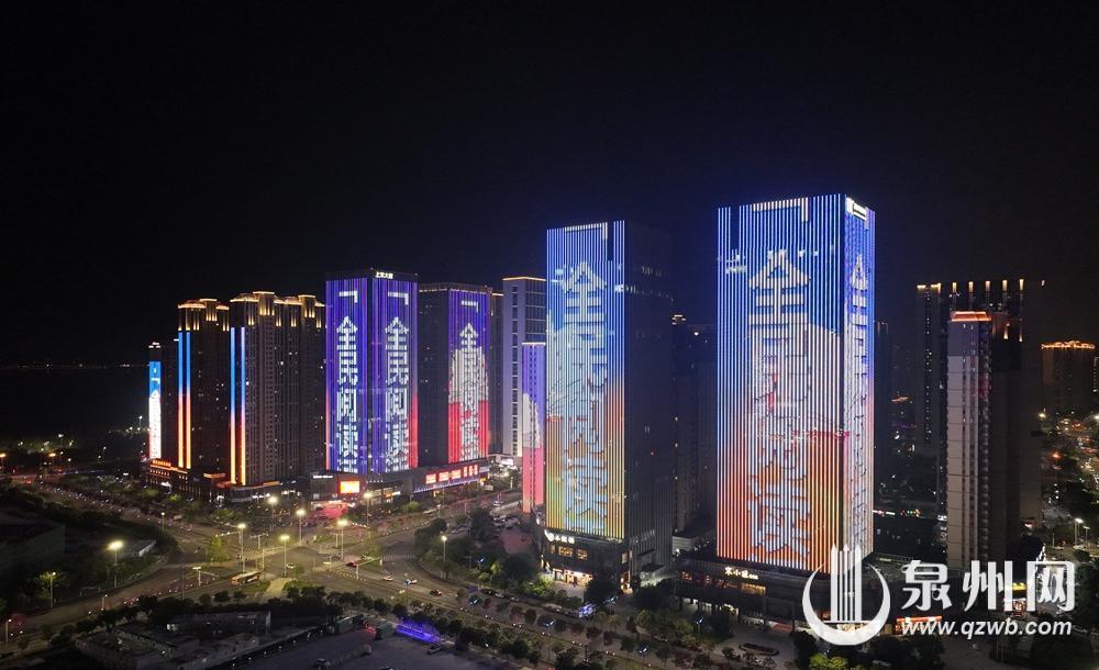 4月20日,“全民阅读活动周”灯光秀在泉州中央商务区点亮。夜幕下,城市楼宇亮起书香主题光影,滚动展示阅读标语与世遗文脉元素。
