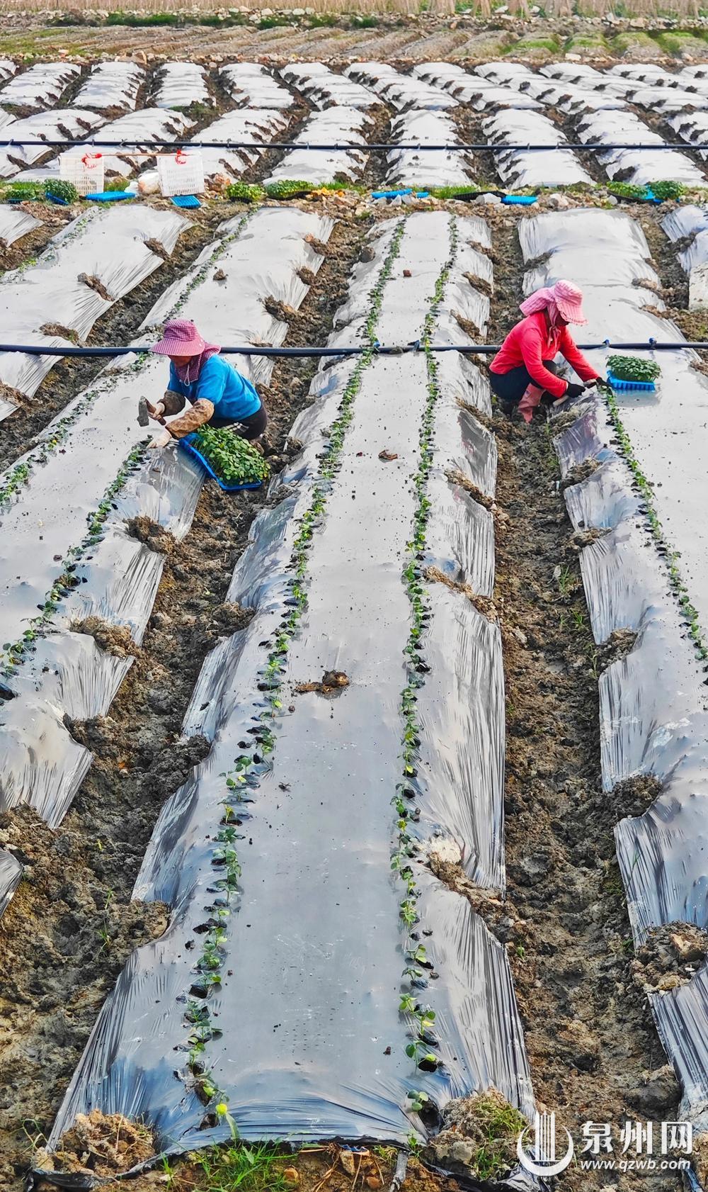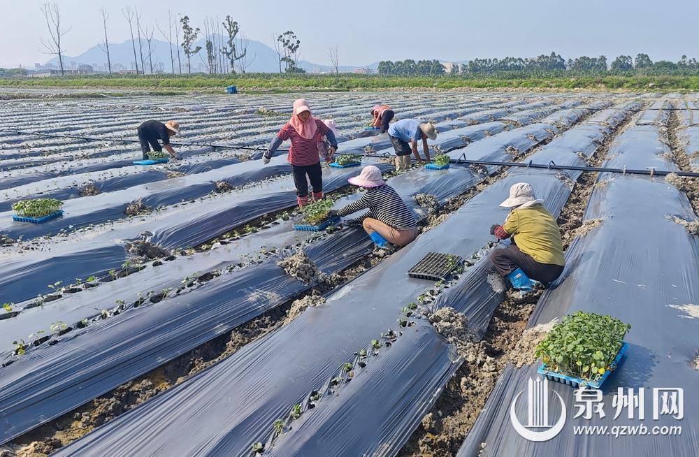 昨日,在晋江九十九溪流域,菜农们在烈日下忙着种植秋葵。(陈清云 王柏峰 摄)