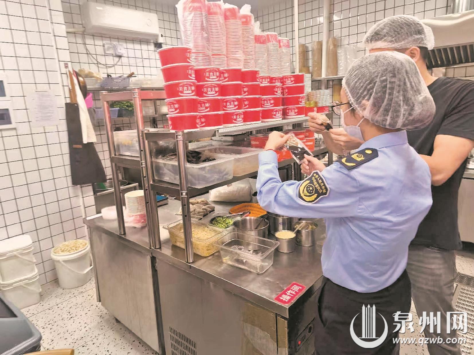 晋江市市场监管局采取“实地检查+现场快检+溯源追踪”形式,开展“网络餐饮随机查”行动,重点聚焦外卖餐饮店的食材质量、后厨环境卫生、从业人员健康管理、原材料进货查验及索证索票等关键环节进行检查;对平台上公示信息与线下实体店的情况进行比对,严厉打击“一证多网店”等违法行为;对部分食材进行现场快速检测,针对疑似不合格食材,同步对其供货商开展核查溯源追踪。
