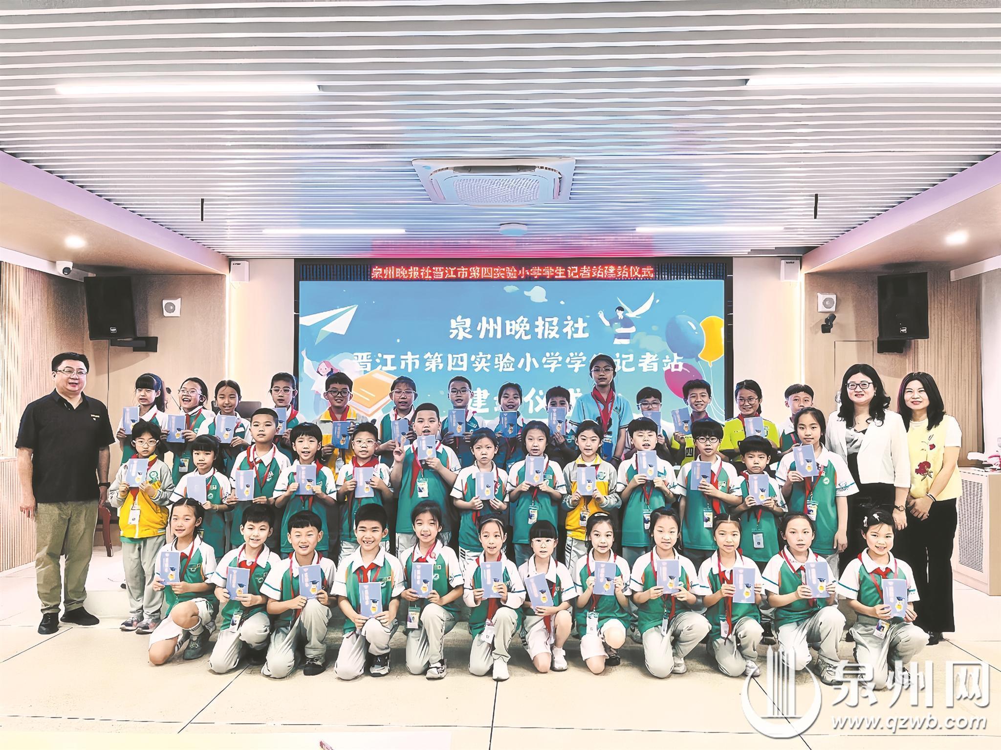 泉州网4月22日讯(融媒体记者颜雅珍 林婕茹 通讯员倪少红 文/图)4月21日,泉州市学生记者团第136站——晋江市第四实验小学学生记者站正式授牌成立。泉州晚报社融媒运营部副主任黄宝阳,晋江市第四实验小学校长俞彬、副校长蒋迎巧出席了仪式,共同为41名学生发放小记者证和专属采访本。