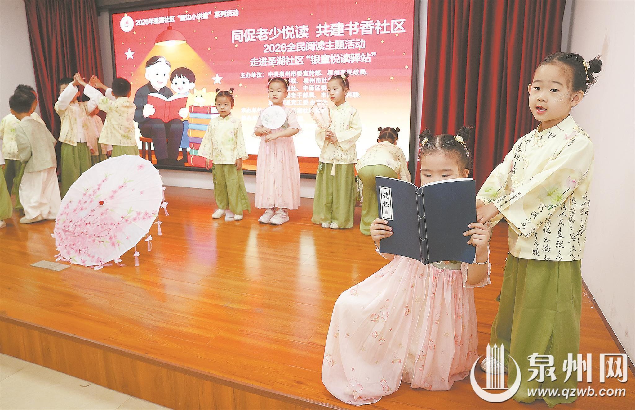 泉州网4月22日讯(融媒体记者陈玲红 庄丽祥 文/图)4月21日上午,以“同促老少悦读 共建书香社区”为主题的2026年全民阅读月主题活动在泉州市丰泽区东湖街道圣湖社区拉开帷幕。活动由中共泉州市委宣传部、泉州市民政局、泉州市侨联、泉州晚报社、达利食品集团联合主办,圣湖社区承办,通过老少共读展演、非遗手工体验、健康义诊等多种形式,为社区居民带来一场内容丰富、浸润书香的文化盛宴。