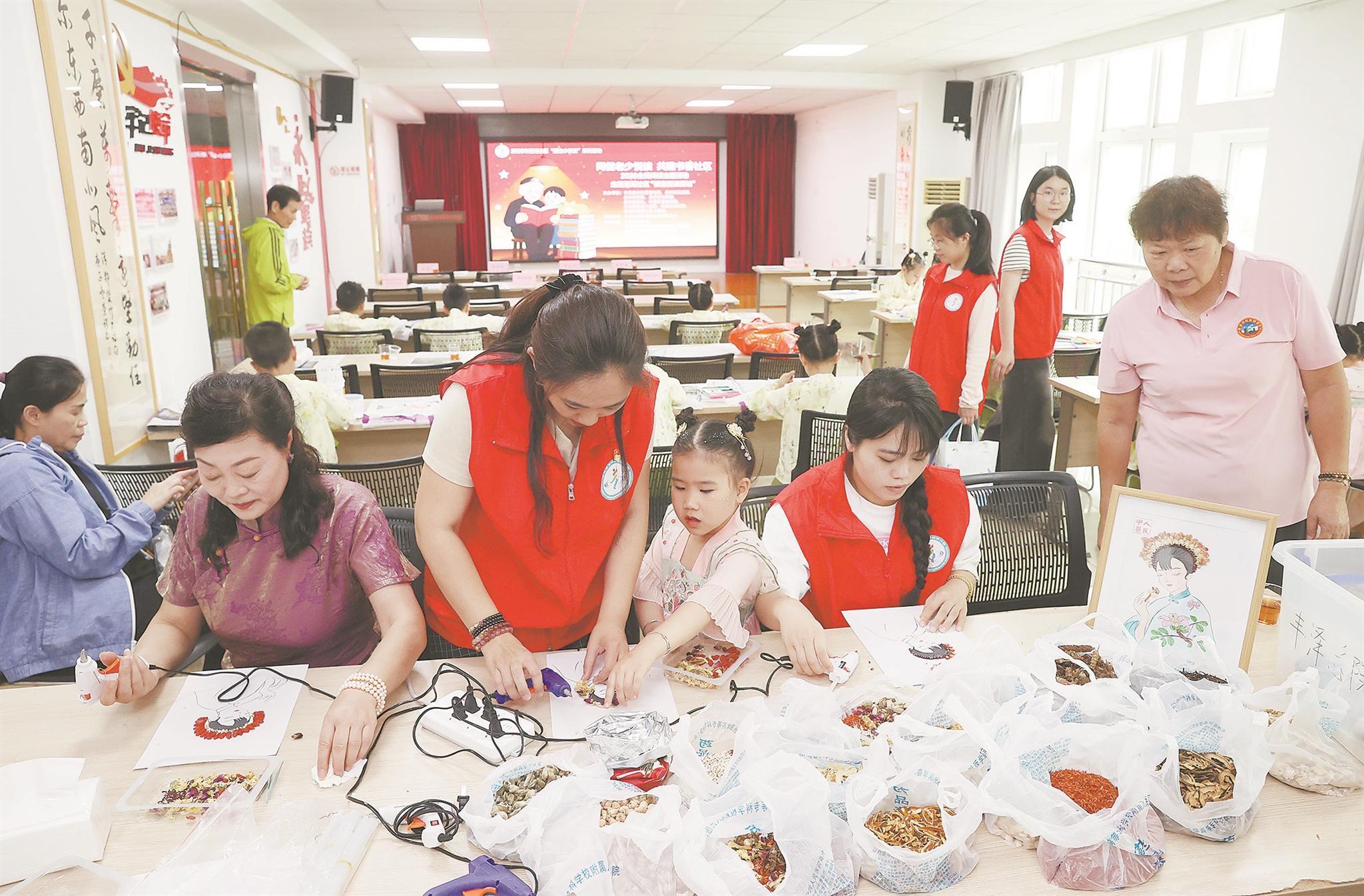 展演结束后,分层体验与互动区域陆续开展活动。泉州医学高等专科学校附属人民医院在现场设置了义诊服务点,不少居民尤其是老年朋友前来咨询健康问题并体验了拔罐、艾灸等中医项目。手工体验区,由泉州医高专附属人民医院带来的“中药簪花贴画创作”吸引了许多居民。枸杞子、红豆、菊花、百合等十几种中药材成了创作材料,大家在老师的指导下仔细粘贴,制作出各式各样、兼具药香与美感的簪花作品,特色十足。另一边,由泉州市风筝协会组织的非遗DIY手绘风筝活动则成了孩子们的最爱,小朋友们发挥想象力,用彩笔在风筝上绘出自己心中的图案,现场充满了欢声笑语。