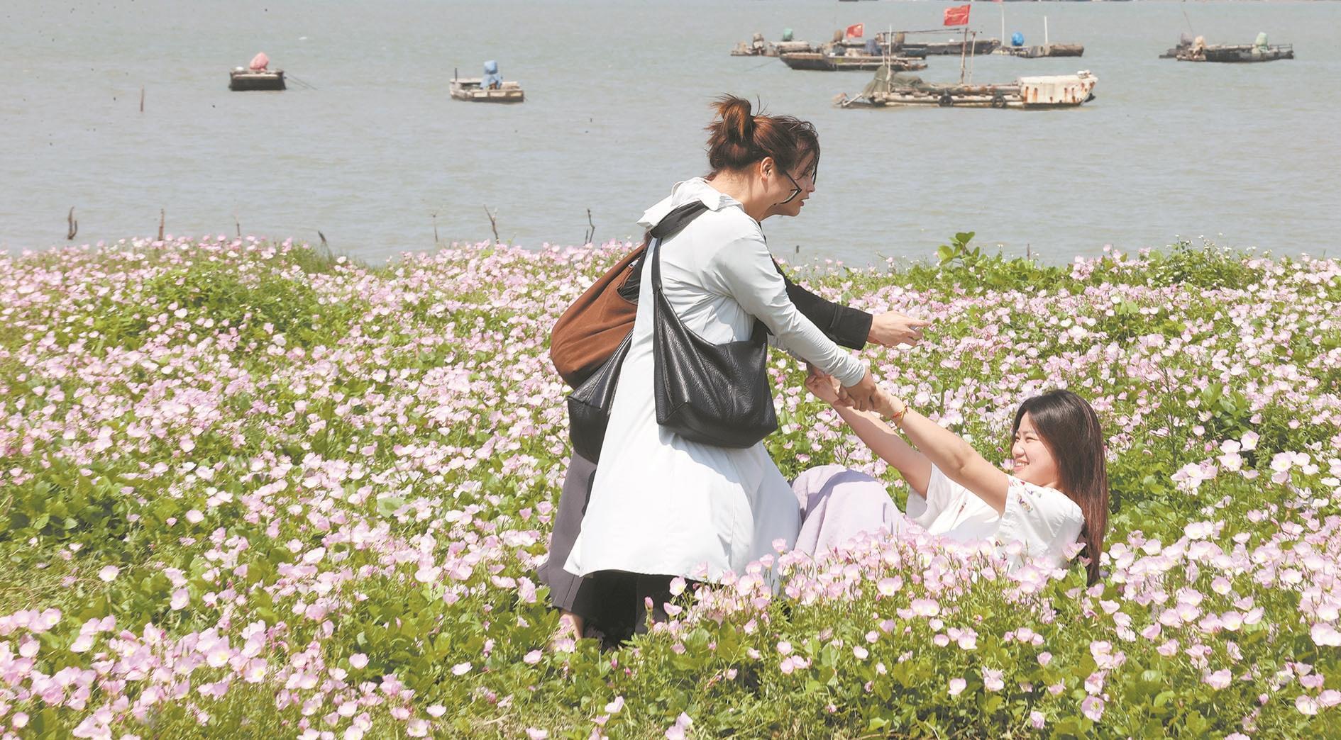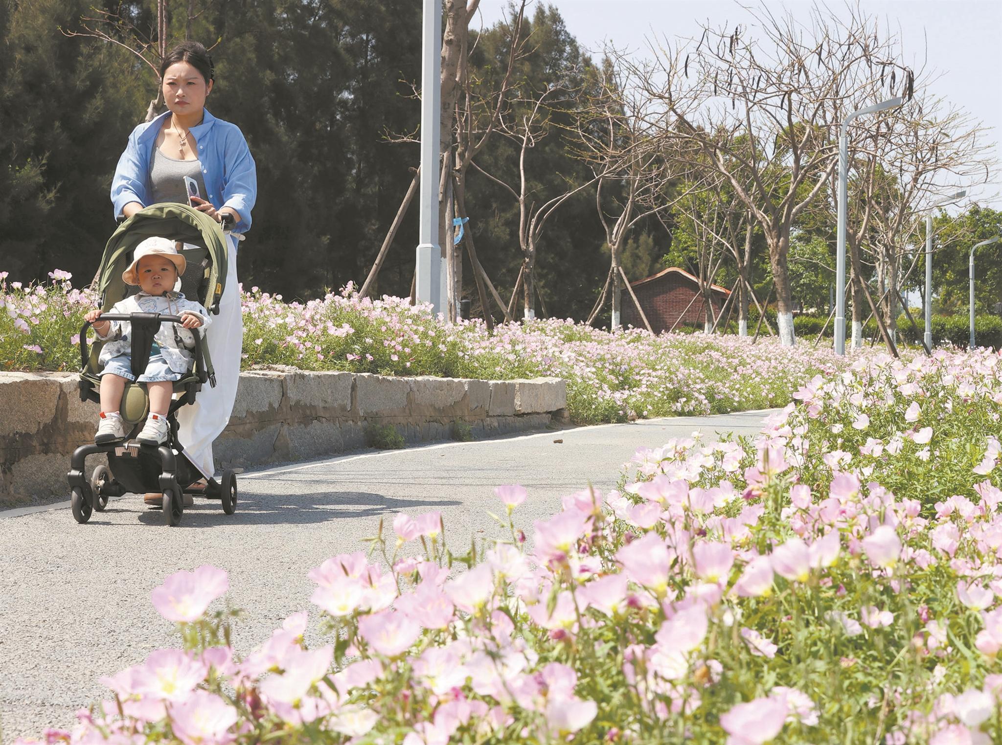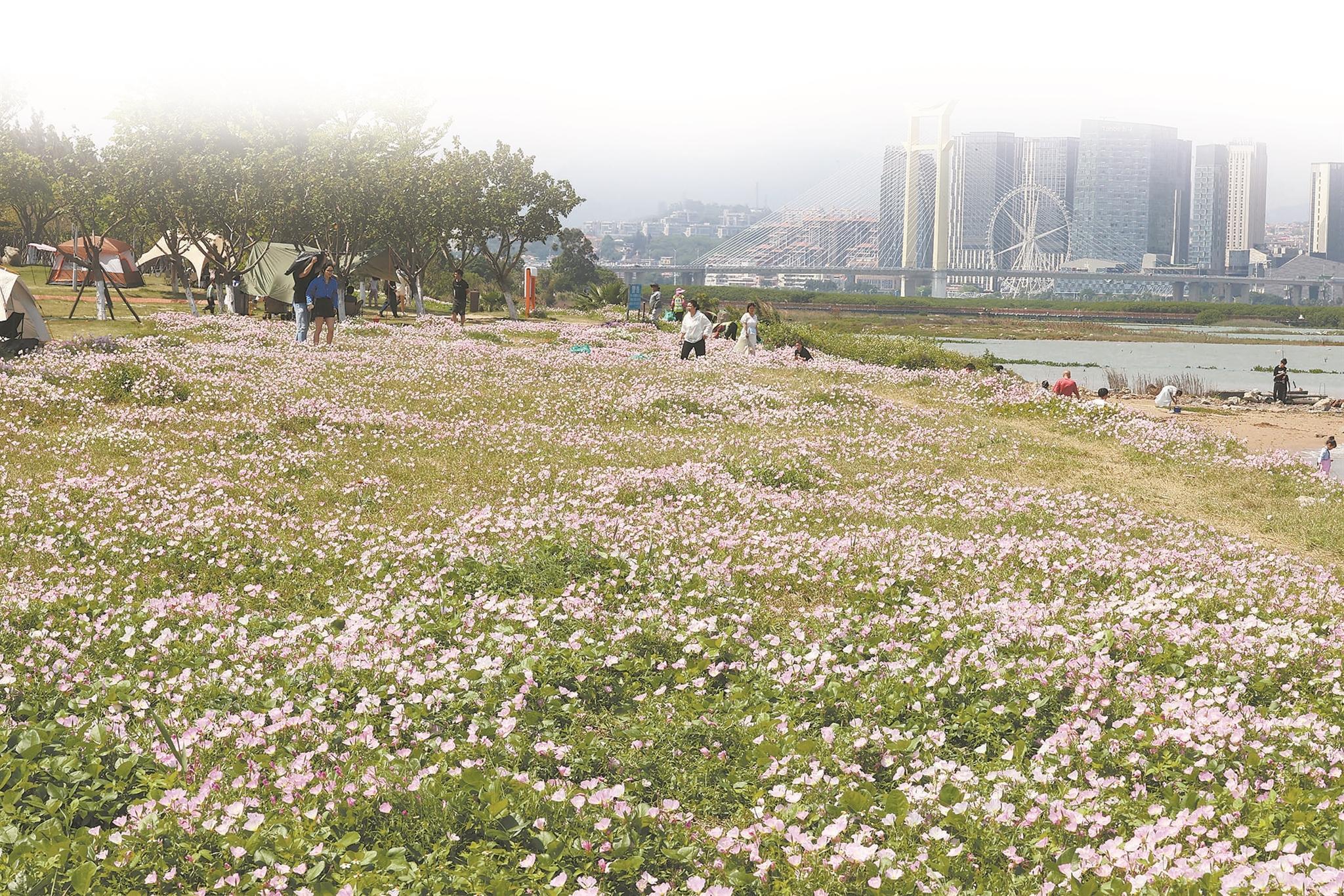近日,晋江蓝色海湾沙趣园成为市民打卡新热点,园内大片美丽月见草热烈绽放,形成一片粉嫩的“网红花毯”,为海岸增添了浪漫气息。