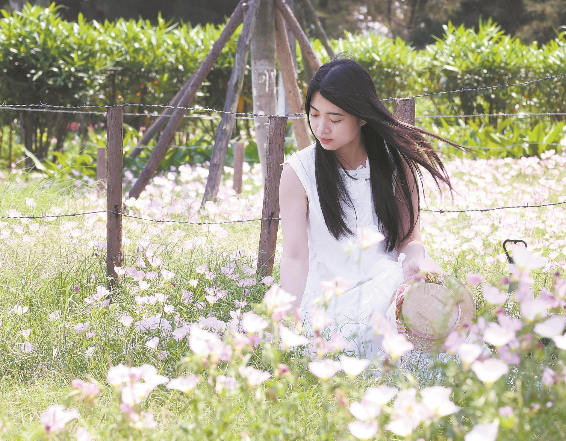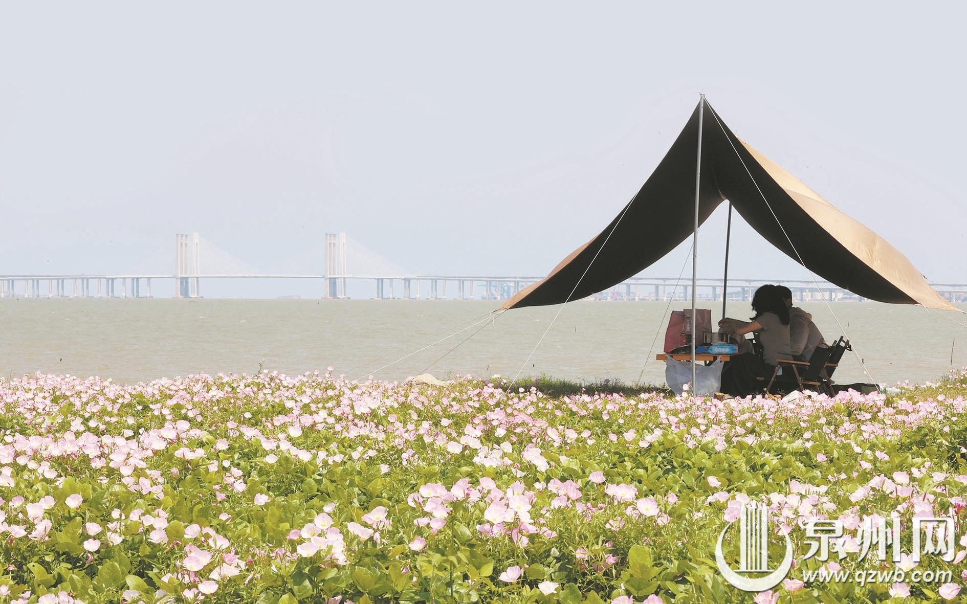 从晋江大桥出泉州市区,沿沿海大通道行驶不远,便能看到这片令人沉醉的花海。粉色的美丽月见草一朵挨着一朵,随风摇曳,花朵娇大、色泽柔和,成片蔓延开来,宛如一块铺开的粉色绒毯,吸引不少市民驻足观赏、拍照留念。