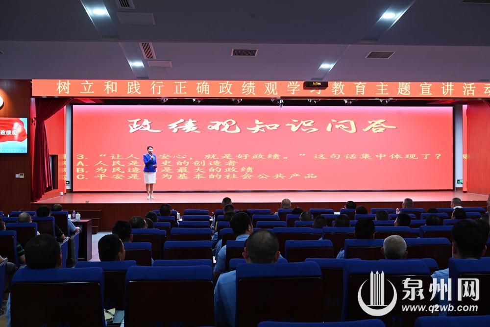 来自泉州市直机关“刺桐红”宣讲团、泉州红色故事志愿宣讲团的五位宣讲员依次登台,通过生动的讲述和真挚的情感,将林俊德、潘加声、陈欠水等泉州英模人物,以及移民管理警察、爱国华侨等不同战线上的奋斗者群像娓娓铺陈。宣讲间隙还设置了政绩观知识互动问答环节,吸引台下听众踊跃抢答,将“功成不必在我,功成必定有我”“把政绩树在人民群众心中”的共识植入人心,在思辨与共鸣中深化了对正确政绩观核心要义的理解。