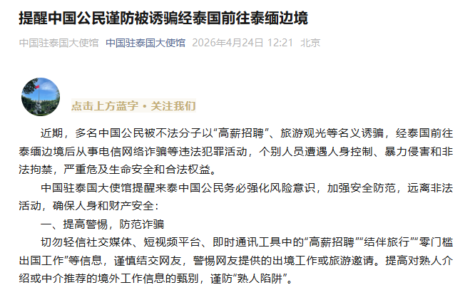 近期,多名中国公民被不法分子以“高薪招聘”、旅游观光等名义诱骗,经泰国前往泰缅边境后从事电信网络诈骗等违法犯罪活动,个别人员遭遇人身控制、暴力侵害和非法拘禁,严重危及生命安全和合法权益。