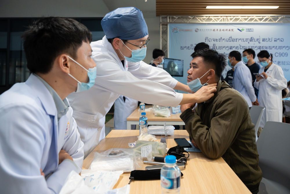 2月9日,复旦大学附属眼耳鼻喉科医院医疗团队在老挝万象玛霍索综合医院义诊。新华社发(凯乔摄)
