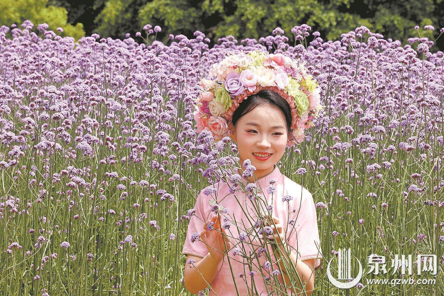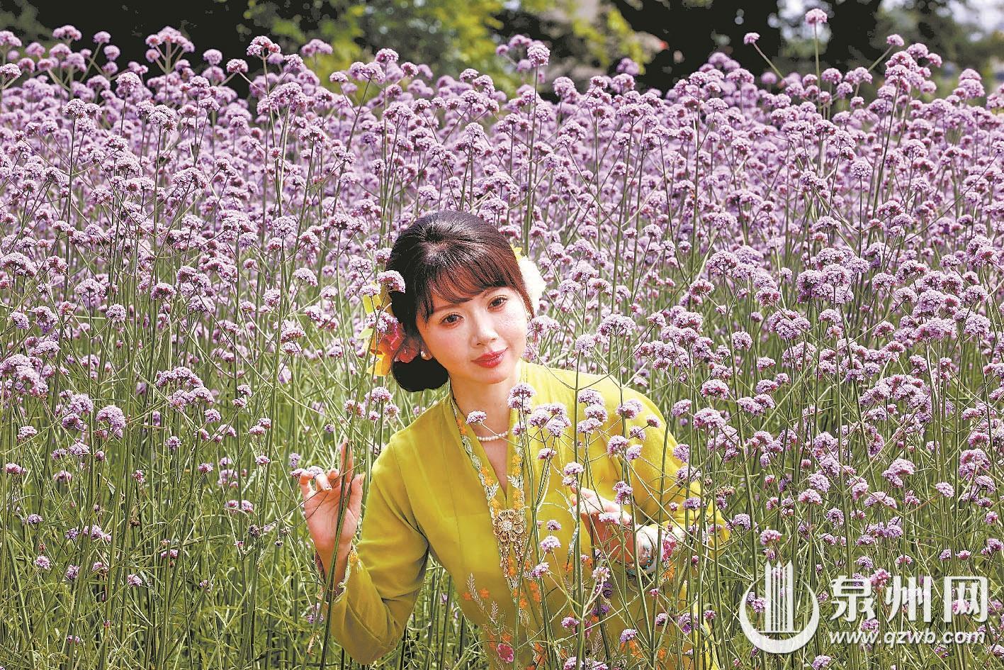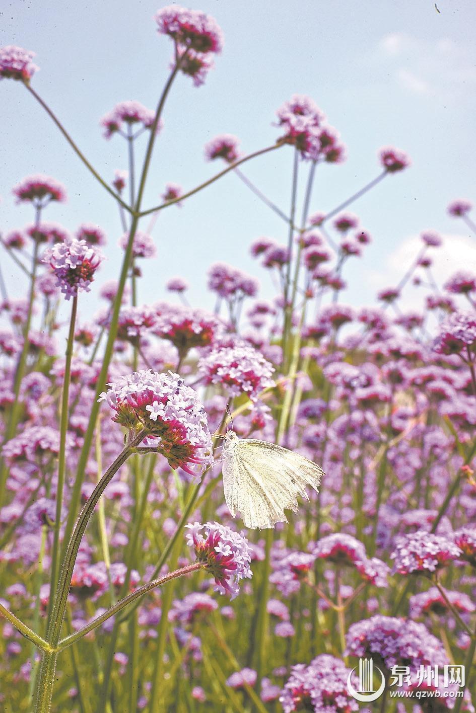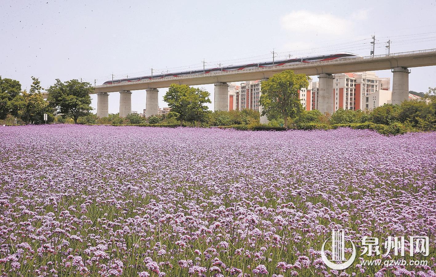 春夏之交,芳菲正盛。近日,泉州连片柳叶马鞭草进入盛花期,浪漫唯美的紫色花海与穿梭飞驰的动车交相辉映,勾勒出独属于闽南春日的治愈景致,频频刷屏各大社交平台。其中,晋江梧林传统村落凭借“动车穿花海、古厝映繁花”的稀缺视觉奇观,一跃成为泉州春日新晋顶流打卡地,被网友盛赞为“泉州版普罗旺斯”。走进古村落,朝东楼周边的大片柳叶马鞭草肆意绽放,层层叠叠的淡紫色花穗连片铺展,随风摇曳起伏,化作温柔浪漫的紫色花浪,氤氲出朦胧梦幻的氛围感,令人仿佛闯入印象派油画般的春日秘境,让人流连忘返。不同于普通花海的景致,这里独一无二的绝美构图,造就了别处难寻的春日盛景。疾驰的动车凌空穿行于紫色花海之上,灵动鲜活;背景错落坐落着独具南洋风情的红砖古厝,精致的哥特式窗廊点缀其间,现代交通活力、自然花海风光与百年侨村古韵完美交融,层次丰富、氛围感拉满,形成极具冲击力的视觉盛宴。