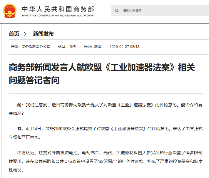 答:4月24日,商务部向欧委会正式提交了对欧盟《工业加速器法案》的评论意见,表达了中方正式立场和严正关切。