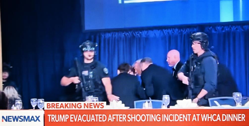 这张4月25日拍摄的视频截图显示,美国总统特朗普在华盛顿白宫记者协会晚宴发生“安全事件”时在安保人员护送下离开。新华社记者李睿摄