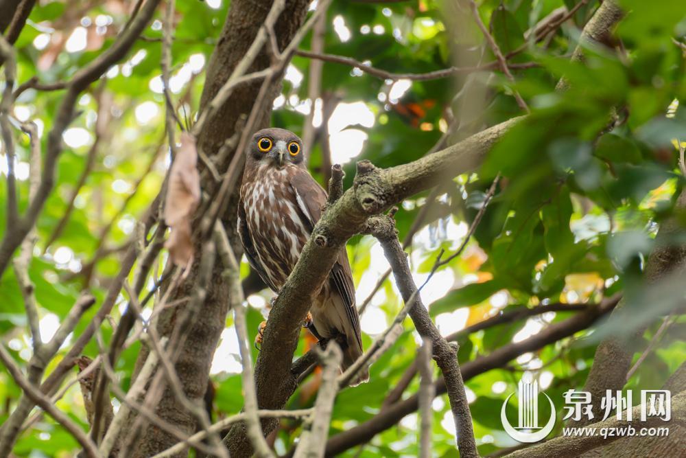 “我刚拍完照,它突然惊觉快速穿过树林飞离,紧跟着后面一只一起飞走,来不及拍下!”陈荣华颇为遗憾地说,近日,他前往泉港后龙镇岩山边的水库巡山时,意外偶遇了这只机警的北鹰鸮。镜头中,北鹰鸮体态修长,身披巧克力棕色的羽衣,腹部洁白且缀有红棕色条纹,一双金黄色的眼睛格外引人注目,飞行时身姿似鹰,灵动又矫健。他猜测,这只北鹰鸮大概率是春迁途中路过泉州,短暂停歇觅食。