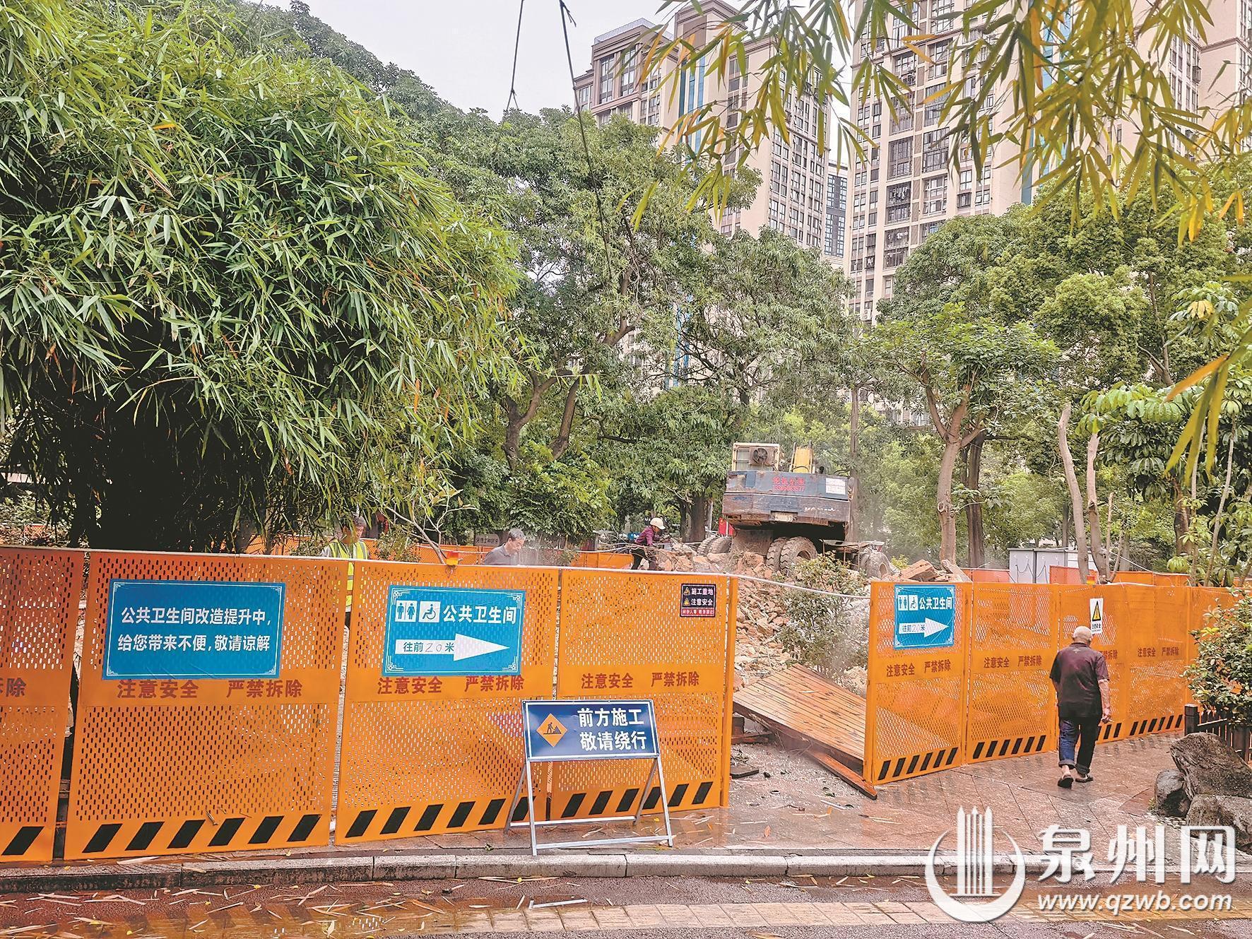 记者在现场看到,刺桐公园靠东涂街一侧的公厕正被一辆大型机械拆除,道路一侧围起了橙色的施工围挡。围挡上张贴着“公共卫生间改造提升中,给您带来不便,敬请谅解”提示标语,前方立着“前方施工 敬请绕行”等施工警示牌,并配有“公共卫生间往前20米”的方向指引标识。围挡内部散落着施工建材和碎石,而围挡外的道路则满是泥水。