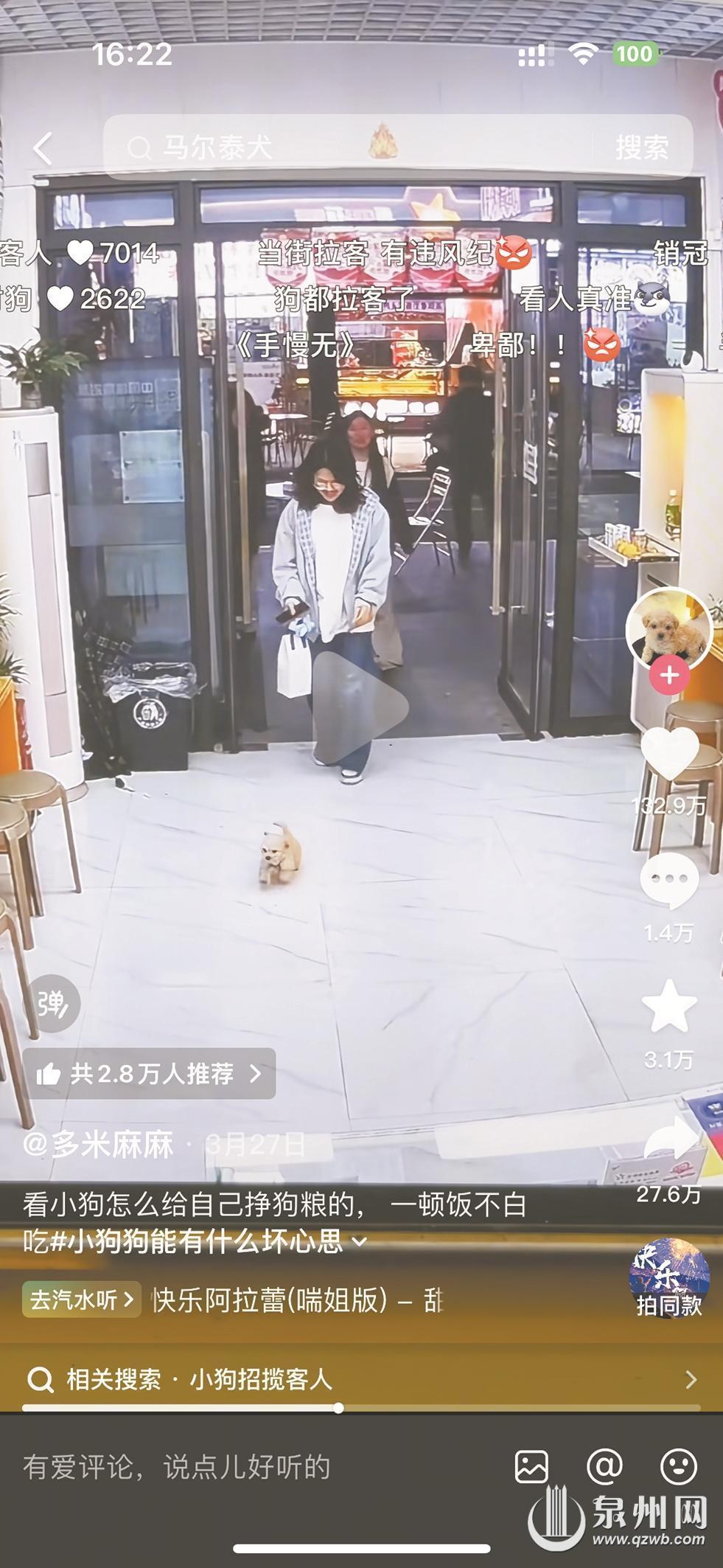 真正让多米“爆火出圈”的,是3月27日发布的那条视频——镜头里,多米摇着毛茸茸的小尾巴,主动跑到店门口,对着路过的行人热情摇尾、探头互动,像个小向导般邀请路人进店;客人一进门,它又屁颠屁颠地跑在前面引路,乖萌模样瞬间戳中无数网友的心。这条视频的播放量一路飙升至3600万,点赞量更是突破130万。后续,张诗艺在3月28日、4月6日发布的两条视频,也同样收获了大量关注。