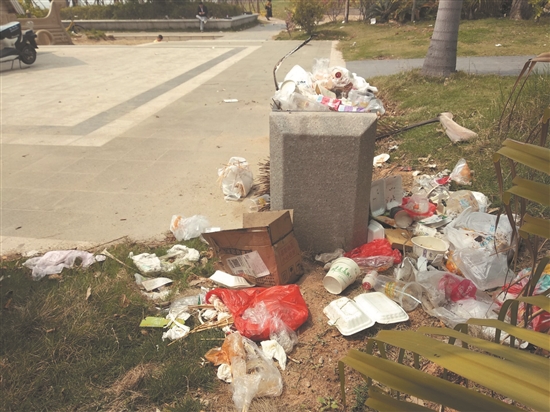 这段时间,许多市民到公园、野外踏青,放松心情。清明节假期,市民郑先生和家人到中心市区东海江边一带游玩,“这边的绿化搞得挺好的,景色宜人,但是环境卫生却与美景不符,垃圾桶垃圾满溢,绿地上、路上、石椅周边都是垃圾。”不仅是郑先生,到此处休闲的其他市民也发现,这里已成“卫生死角”。