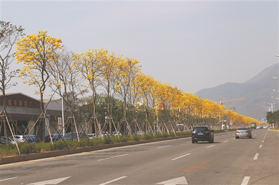 黄花风铃木怒放 造就"金黄之路" 花带长达4.5公里