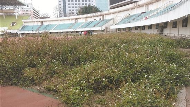 侨乡体育中心体育场草皮变草丛,还有人种起了地瓜