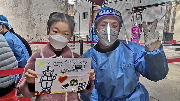 晋江东石四居核酸采样点,小朋友将自己的画作赠予医护工作者表达感谢。