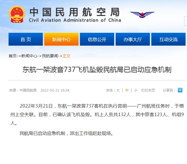 民航局确认东航一架波音737飞机坠毁,机上共132人。