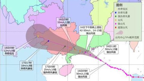预计,“山竹”将以每小时30公里左右的速度向西偏北方向移动,将于16日下午到晚上在广东珠海到吴川一带沿海登陆(14-15级,42-50米/秒,强台风级)。