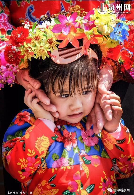16日上午,丰泽蟳埔妈祖巡香民俗活动热闹上演,千名蟳埔女参加踩街,锣鼓喧天中,小朋友捂起了耳朵。