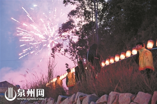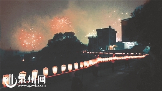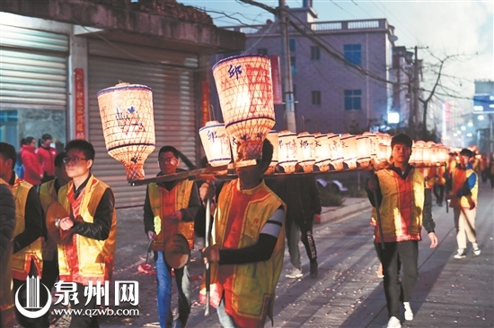 村民们将花灯绑在长板凳上,板凳头尾相连,村里的青壮年扛着长板凳在村子绕一圈,所到之处鞭炮飞起、锣鼓震天。板凳灯夜幕下犹如一条长龙,游走在村庄古老石巷和田野间,成为泉州独特的乡村民俗文化。
