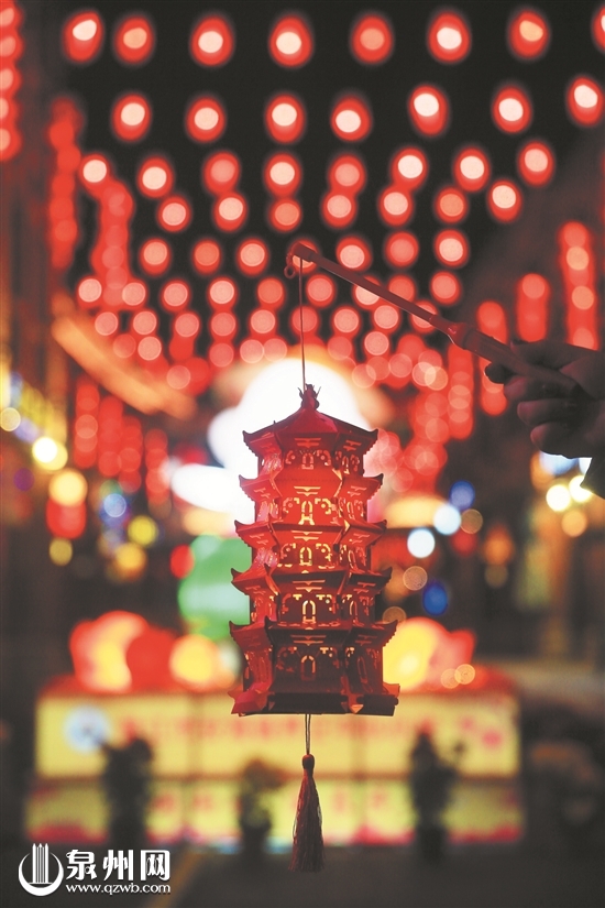 晋江安海三里街上,不少孩子提着白塔造型的“状元灯”,跟随父母逛街赏灯。