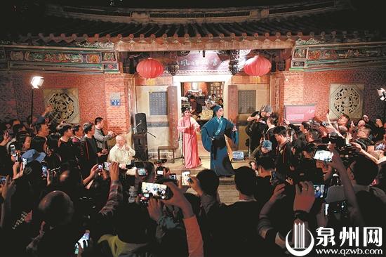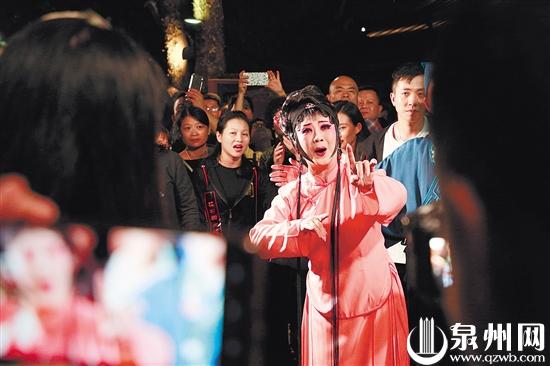 当晚7时许,随着伴奏响起,梨园戏经典唱段和闽南语歌曲《莲花落》《爱拼才会赢》《爱情的恰恰》等暖场表演在该街区风雅颂书局门前举行,拉开了演出序幕。