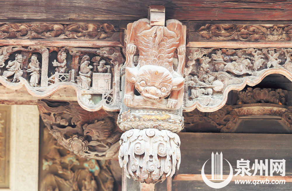 木雕是闽南古建筑中常见之物。一般来说,直接承重的梁、柱、檩等大木构件是不作雕刻的,而次要承重构件如斗、栱、瓜筒、狮座等多作浅浮雕,联系构件如垂花、竖柴、斗抱、托木、束随、通随、门簪等,大都用透雕的形式。清晚期的建筑,许多构件常作透雕、圆雕以示炫技,如托木雕成龙凤、花草,竖柴雕成仙人、狮虎,栱仔雕成飞仙、力士、螭虎等形状,美轮美奂。