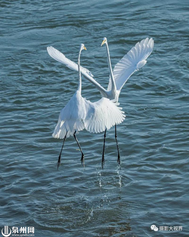 鲤城区泉州顺济桥旁,两只白鹭在水中快乐的飞舞。(陈庆煌 摄)