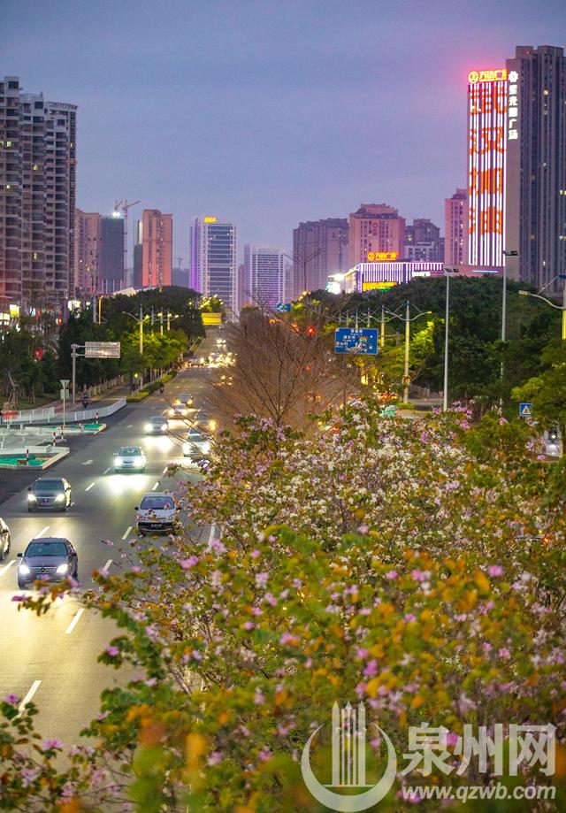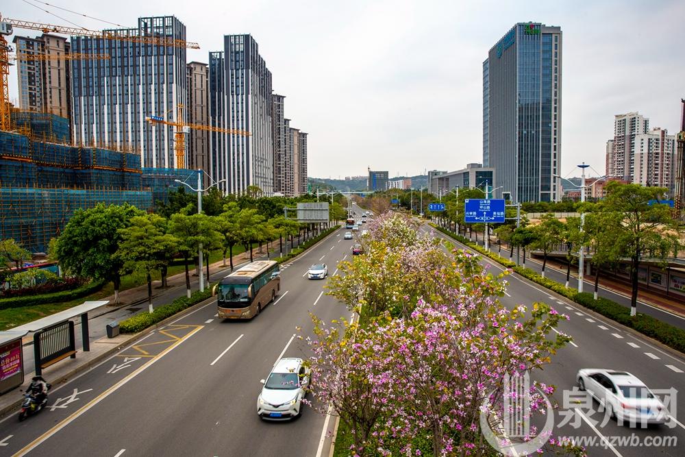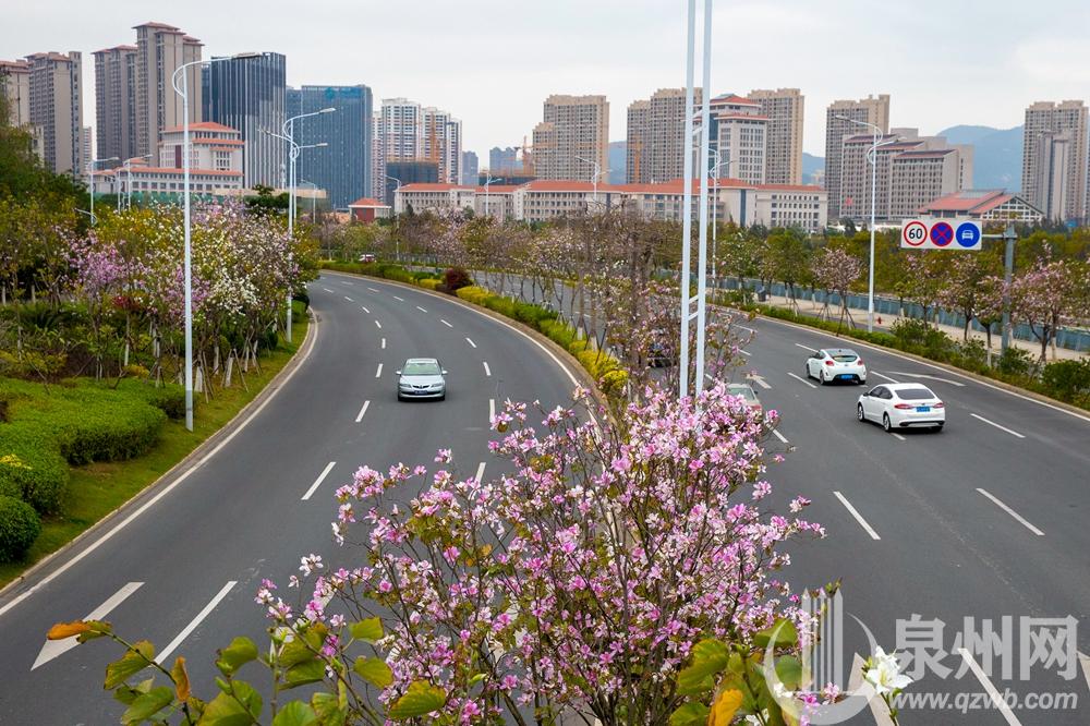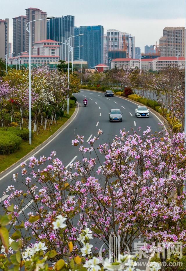 连日来,泉州市区安吉路和山海路,宫粉紫荆迎风开满枝头,繁花似锦,春意盎然。三月的泉州市区百花次第开放,一片一片,一丛一丛,一路一路,灿若云霞,生机勃勃,将泉州打扮得如诗如画。(陈英杰 摄)
