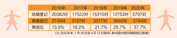 数据显示,近五年来,1月25日至4月12日期间,泉州国内居民结婚登记同比下降,离婚登记2016年至2019年同比上升,2020年下降,而离结比逐年上升。