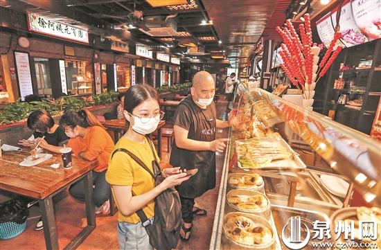 “五一”假期的到来,加上晋江“十行百场千企万店”促消费活动的带动,晋江五店市传统街区迎来新一波消费。图为市民在五店市传统街区的老晋江美食街消费。(林劲峰 许雅玲 摄)