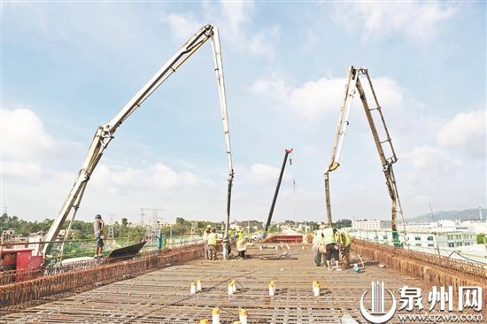 福厦客专5标跨驿峰西路特大桥在泉港区境内,全长1.4公里,其上跨驿峰西路段落采用(40+72+40)米预应力混凝土连续梁的结构设计形式。浇筑现场,两台混凝土泵车双管齐下,源源不断地将混凝土浇筑进已经架设好的钢箱梁模板内,一旁的工人们迅速将混凝土推平、振捣,现场技术员则时时盯着,把控混凝土质量和振捣质量等。首段箱梁总共需要浇筑701.9方C50型混凝土,为了保证浇筑质量,需要20名工人连续浇筑15小时。